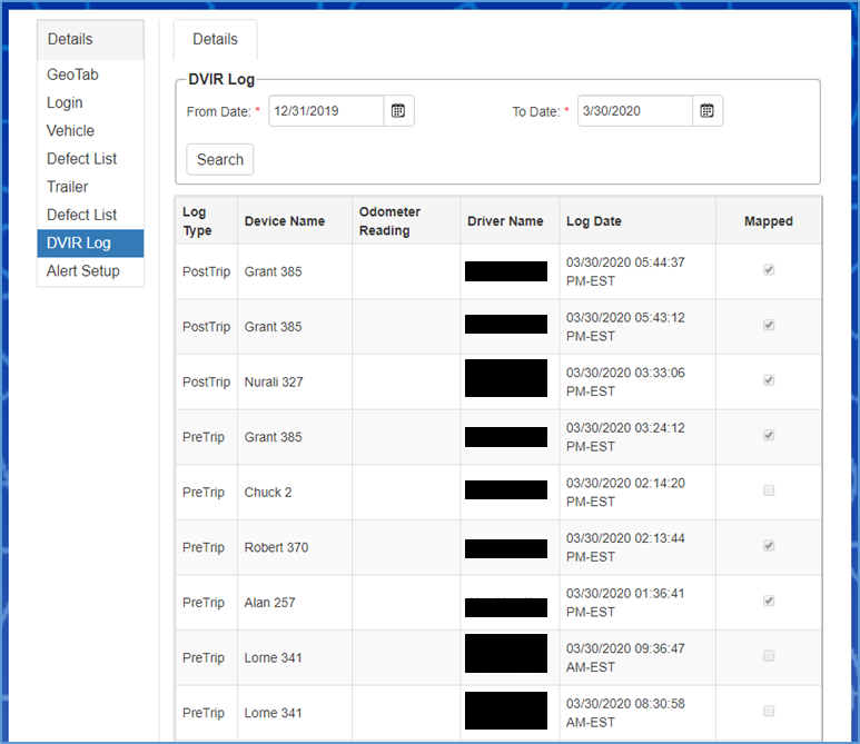 Users can access the following in the DVIR Log module: Log type; Device Name; Odometer Reading; Driver Name; Log Date; and, Mapped.