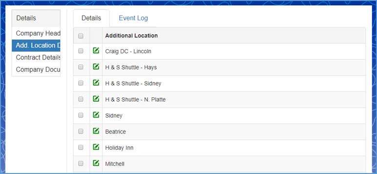 The Add. Location Details screen displays a list of all locations (children, grandchildren, etc.) under the Headquarter area you are currently viewing.