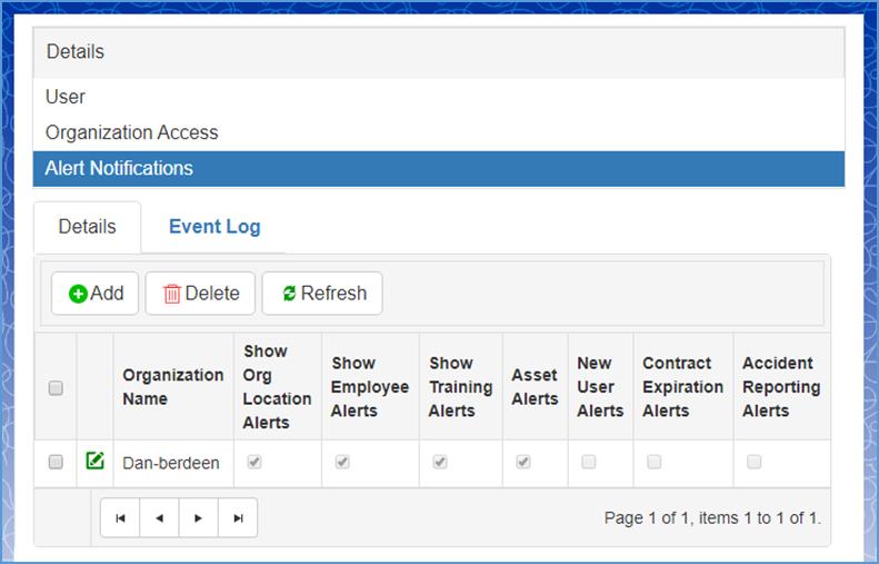 The Details tab on the left hand side of the page lists the following for a specific user: User, Organization Access and Alert Notifications.