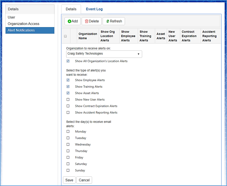 The Alert Notifications page designates: Organization to receive alerts on, the type of alert(s) you want to receive, and the day(s) you wish to receive email alerts.