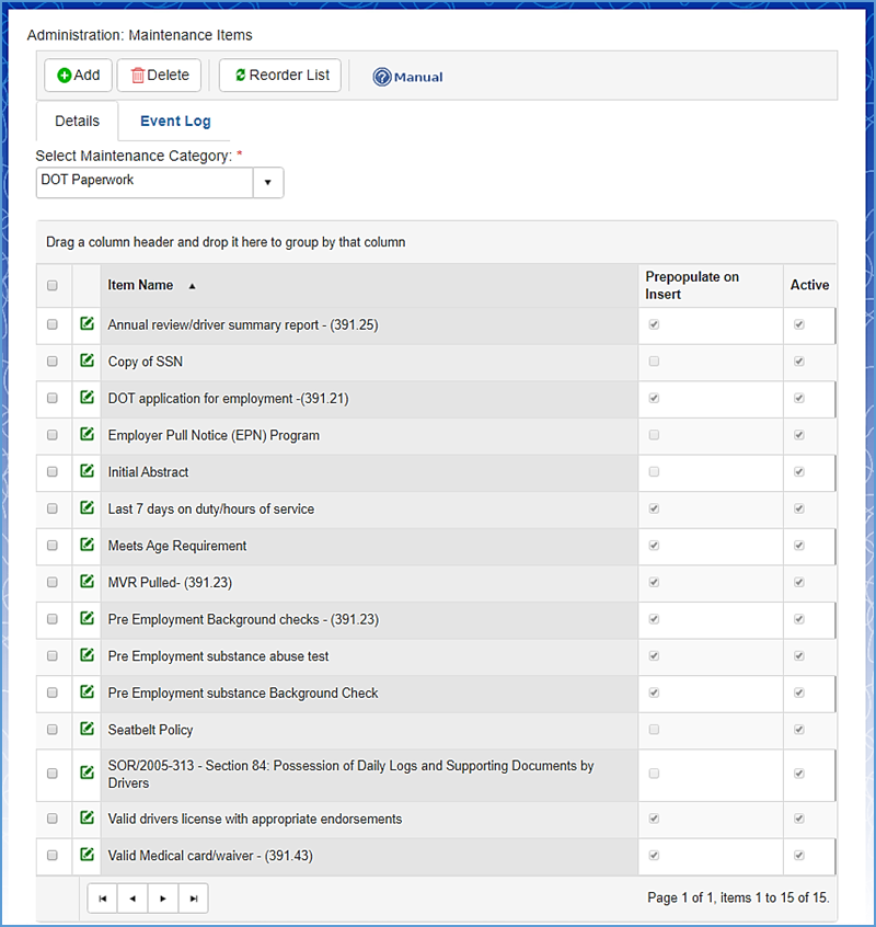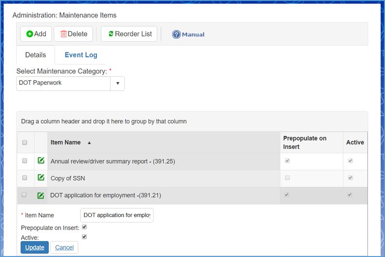 Step 2: Select the maintenance item you want to change. You can do this by clicking the Edit icon on the left hand side of each item or simply double-click the specified category.