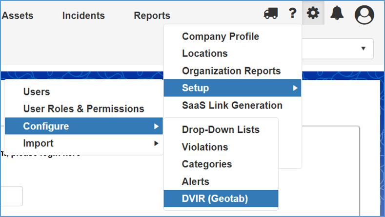 Step 1: Navigate to Settings → Setup → Configure → DVIR (Geotab).