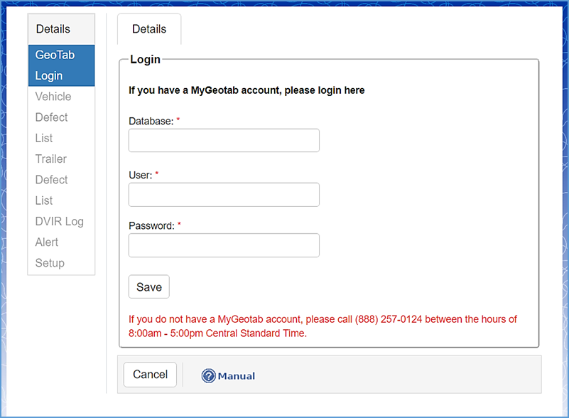 Step 2: The Geotab Login Module allows the user to enter their Database Name, Username and Password for their Geotab login. Fill out the required fields marked by a red asterisk (*) and click the Save button when complete.