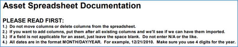 Review the PLEASE READ FIRST section at the top of the Asset Spreadsheet Documentation tab.