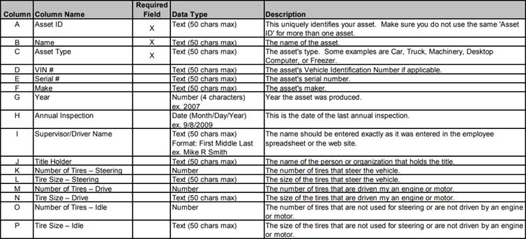 The Asset Spreadsheet Documentation tab is guidance on how to: Fill out the spreadsheet; What each column in the spreadsheet is used for; What format the data needs to be in; and, Character limits for each cell in that column. Refer to the following screenshot.