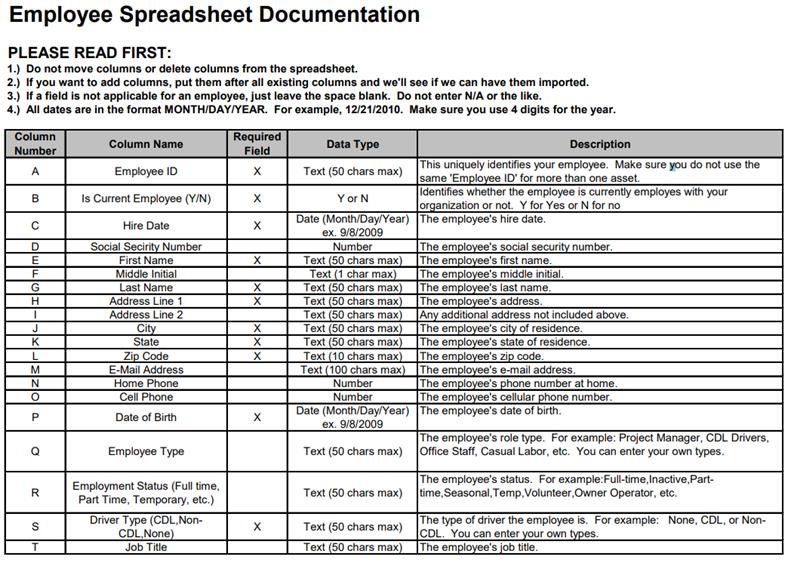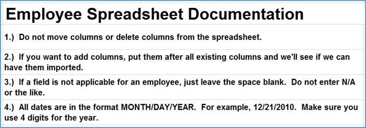 Review the PLEASE READ FIRST section at the top of the Employee Spreadsheet Documentation tab.
