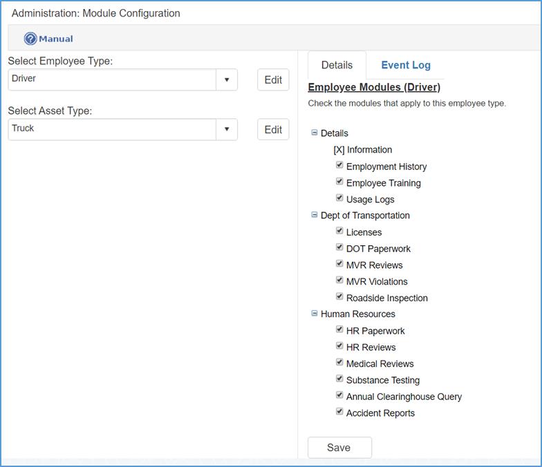 Under Administration Categories, the user can select which modules are needed for their employees and assets. These modules pertain to the employee type and/or asset type.