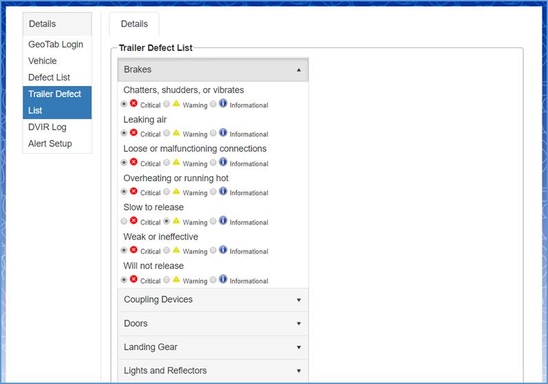 Step 2: As an example, we’ll look at Brakes which is the first section in the Trailer Defect List. To set the severity for your trailer(s) found defects, click the appropriate section.