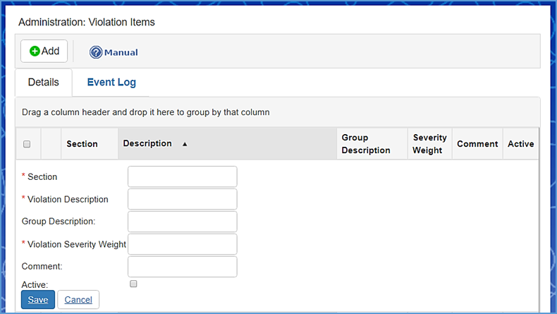 Note: Required Fields include the Section, Violation Description, and Violation Severity Weight.