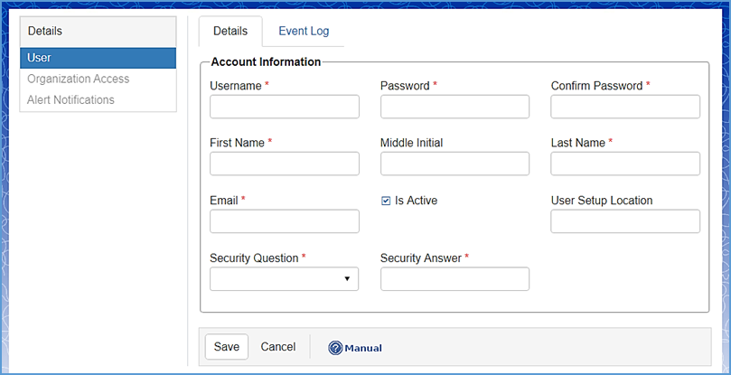 Under Users in the system, you have the ability to add new users, set organization access, and set alert notifications.