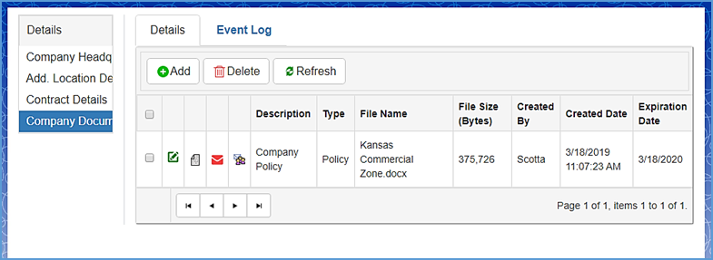 The Company Documents tab allows you to add or upload a company’s document (e.g. Employee Handbook, Processes and Procedures, Contracts, etc.)