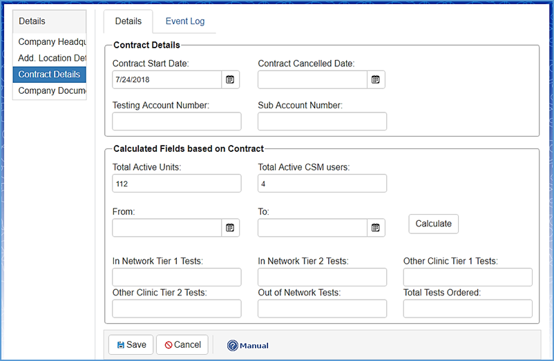 The Contract Details screen displays all information entered by the user which pertains to the current contract in place as well as active units and users.