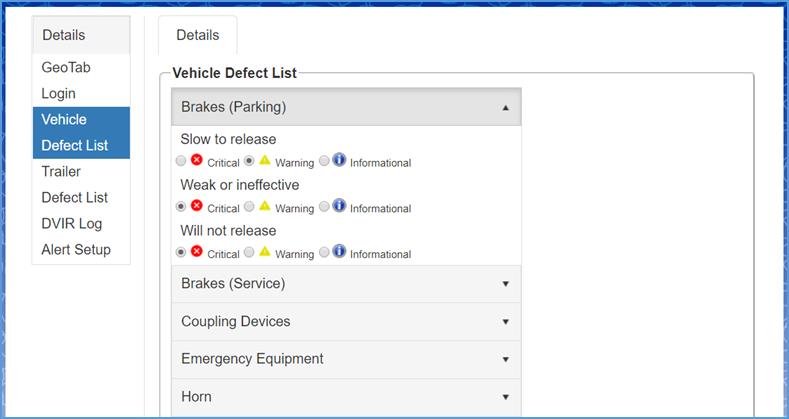 Step 2: As an example, we’ll look at Brakes (Parking) which is the first section in the Vehicle Defect List. To set the severity for your vehicle(s), click the Braking (Parking) field.