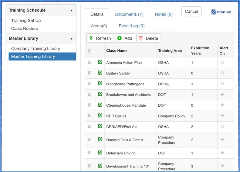 In the Training Program, there are many features you have access to. This includes creating/updating your: Training Setup; Class Rosters; Company Training Library; and, Master Training Library.