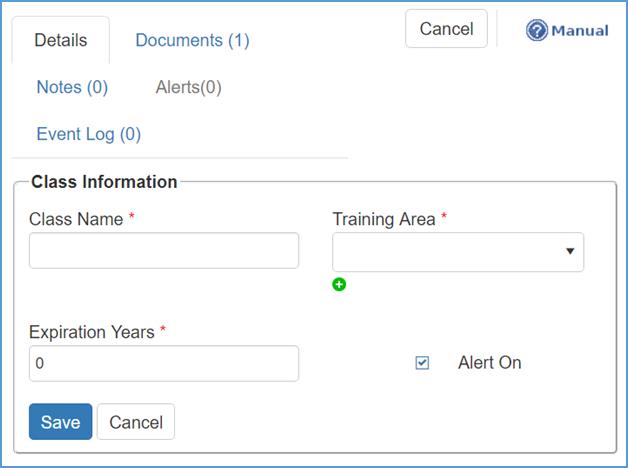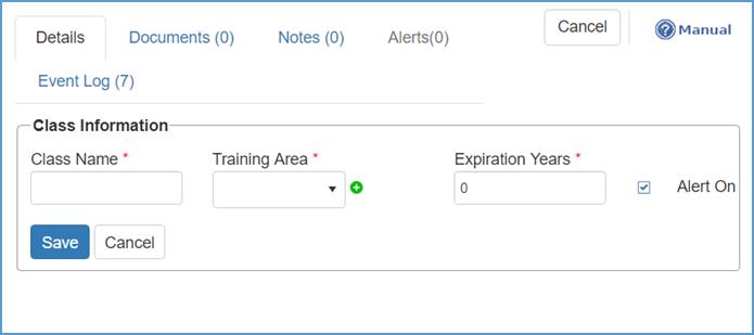 Fill in the required fields, which includes the: Class Name; Training Area; and, Expiration Years.