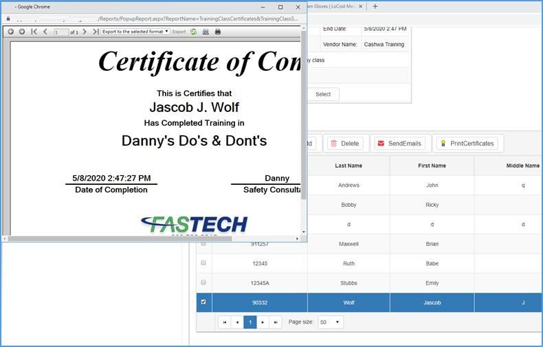 Once your employees in the specified class roster have completed the course, you have the ability to Print Certificates for each individual. To print a certificate, select the employees you want to create certificates for and click the Print Certificates button marked by a purple and yellow ribbon.