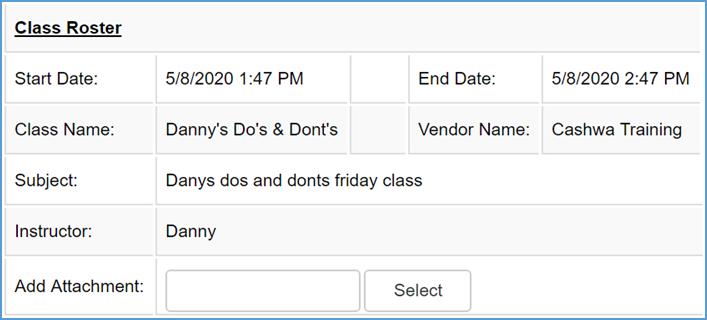 To add any additional documentation (e.g., a scanned copy of the sign-in sheet), click the Select button in the Add Attachment field under the Class Roster grid. Refer to the following screenshot for guidance.