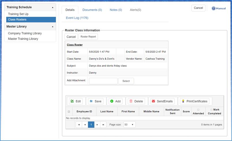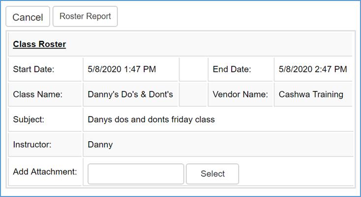 The Class Roster report will include the:Location Name; Start Date; End Date; Class Name; Vendor; Subject; and, Instructor. By printing off the Class Roster report, you can pass it around the classroom to have each employee sign-in, acknowledging their participation in the course.