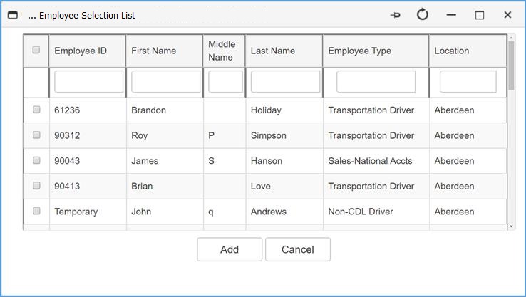 When clicking the Add button, the Employee Selection List window will open, which shows a list of all currently active employees within your organization.