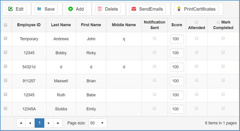 When the training class has been completed, you have the option of manually updating the system by stating if the employee Attended the class, what their Score is, and Mark Completed if the course has been passed. You can complete these actions by clicking the Edit button at the top left-hand side of the roster grid.