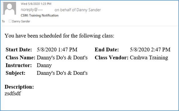 After adding employees to the roster, you have the ability to send emails out notifying them about the class they have been scheduled for. To send an email to the employees in your class roster, click the Send Emails button marked by a red envelope icon. This will send a basic email to the selected employees with details pertaining to the training class. Once notified, the Notification Sent will be reflected under the roster class information. Refer to the following screenshot for an example email.
